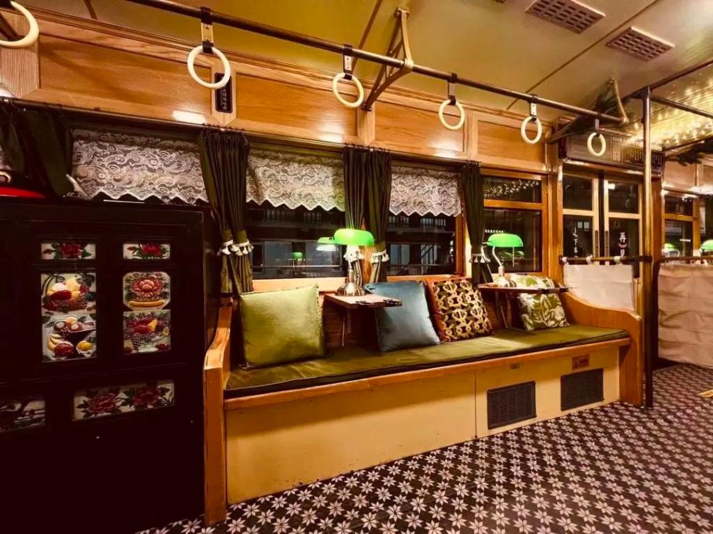 车厢之内,一改普通电车的座椅规划,靠窗的软凳配上复古小桌和台灯、窗帘,灯光柔软,音乐伴着咖啡,温暖而惬意,人们被文艺复古的气息包围。