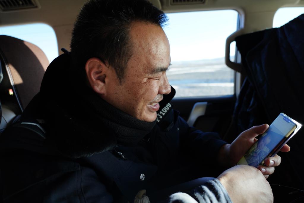 1月19日,巡山队员袁广明在可可西里巡山途中,翻看自己孩子的照片。新华社记者 周盛盛 摄