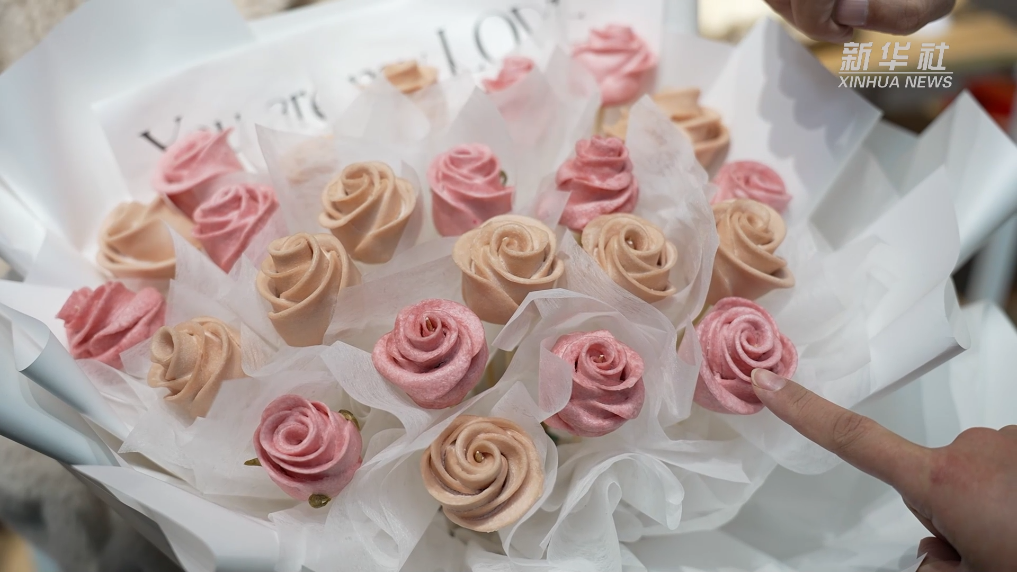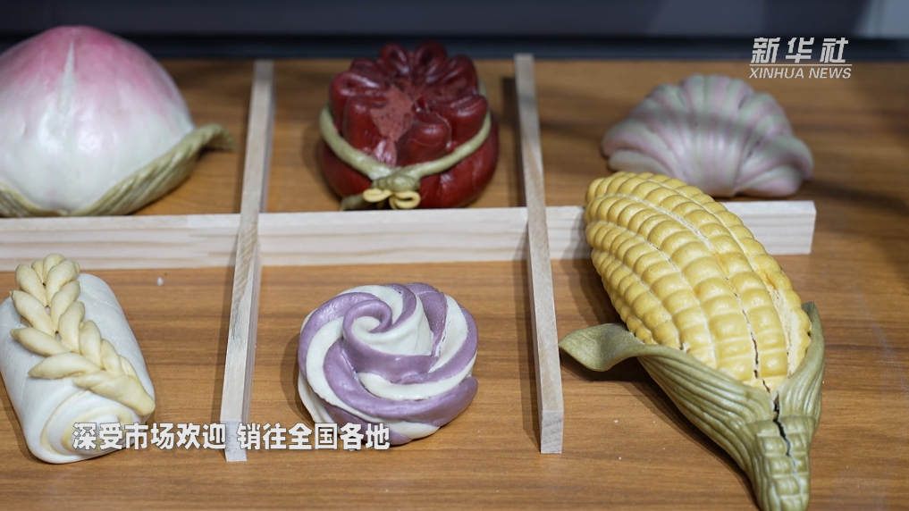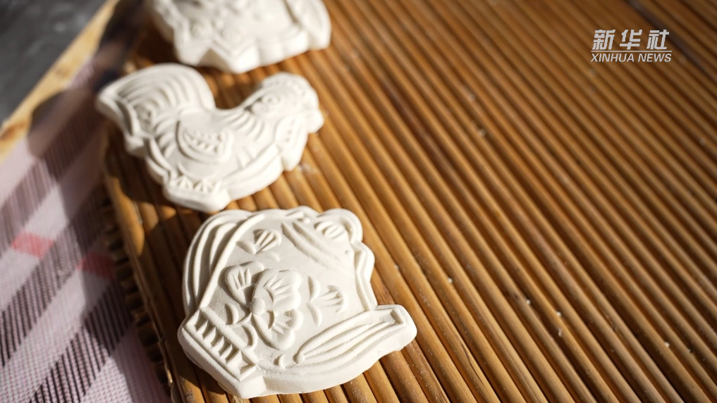 随后在面板上一磕,面花便脱离模子,形成公鸡、寿桃、鲤鱼、葫芦等不同的形状。