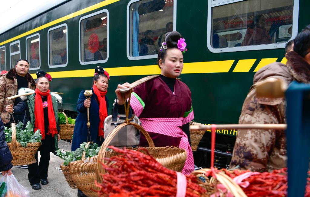 1月26日,在沪昆铁路六个鸡火车站,村民准备登上5640次列车售卖蔬菜和年货。新华社记者 杨文斌 摄