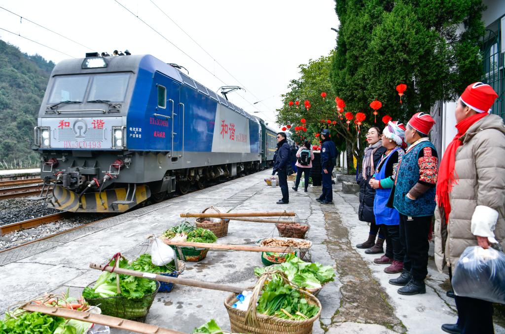 沿线村民搭乘慢火车,出门走亲访友,把深山里的鸡鸭牛羊、瓜果蔬菜、土特产品搬上火车,再运到县城售卖。在这个热闹的“新春山货集市”中,新鲜的蔬菜味、满满的生活味、浓浓的人情味正交织升腾。