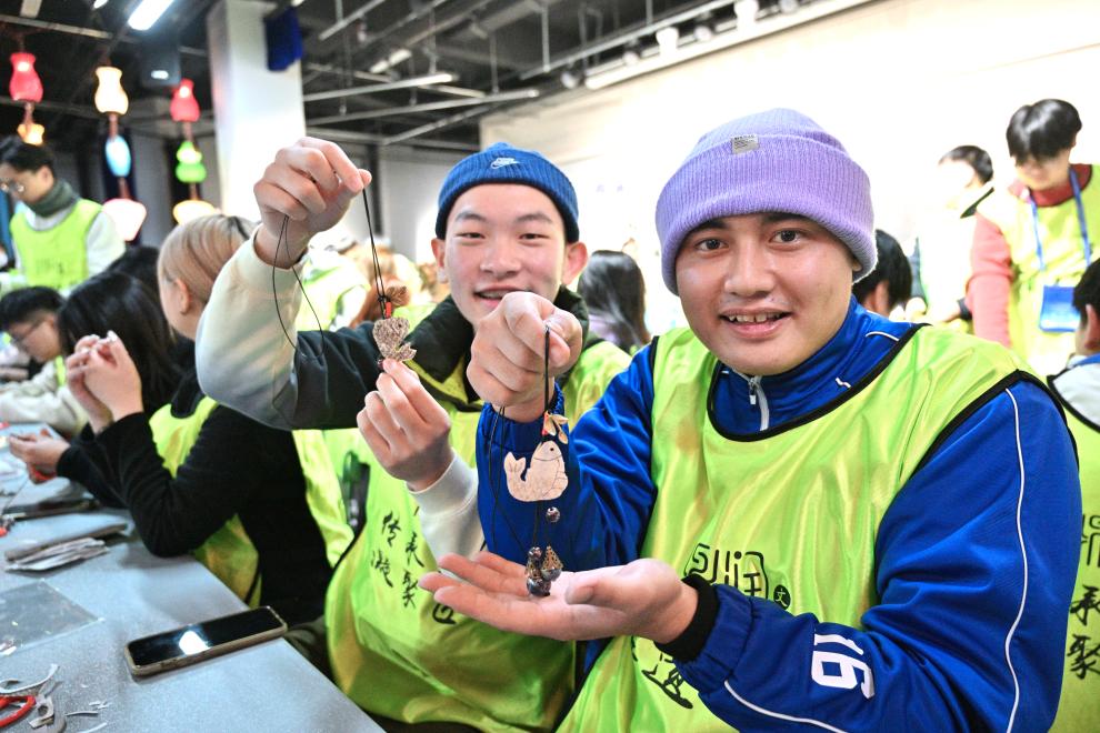 冬令营营员罗正浩(右)和张畯在吉林省松原市鼎润文化创意产业园展示他们制作好的鱼皮项链(1月24日摄)。新华社记者 陈晔华 摄