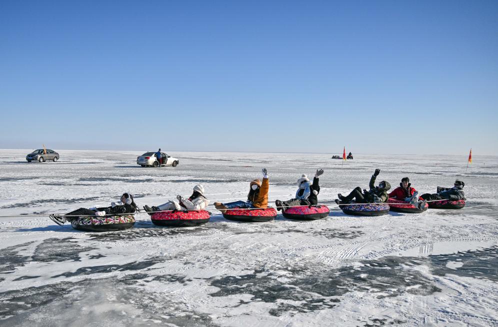 冬令营营员们在吉林省松原市查干湖的冰面上玩雪圈漂移(1月24日摄)。新华社记者 陈晔华 摄