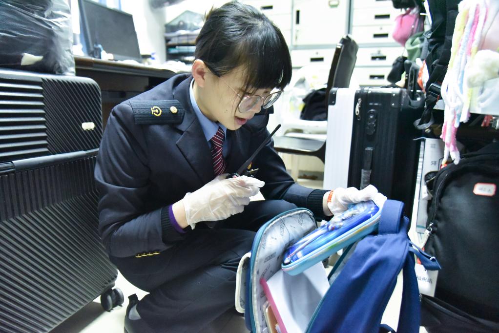 1月28日,福州火车站仓管员陈灵灵在失物招领处查看一件刚刚收到的旅客遗失物品并寻找失主线索。新华社发(江曲 摄)