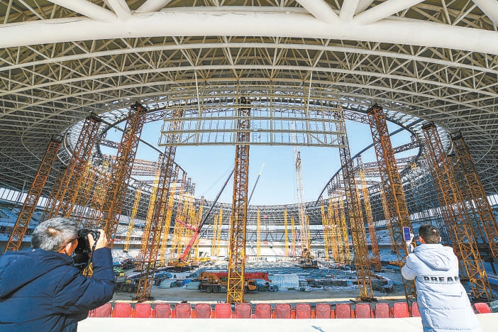 站在体育场南侧广场上,几十台黄色胎架竖立在体育场内,他们承担着吊装任务。每天在三个场馆巡视,张宏伟都要走两万多步。张宏伟笑着说,2024年工程要实现竣工交付,越到后期,细节越多,更要求我们精益求精。奋斗和坚守就是今年春节张宏伟和同事们的主题。他计划把项目部装扮一番增添年味儿,“让同事们过一个难忘且有意义的春节。”