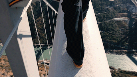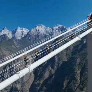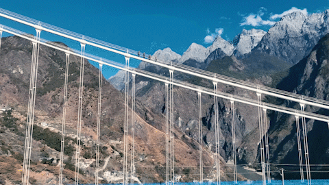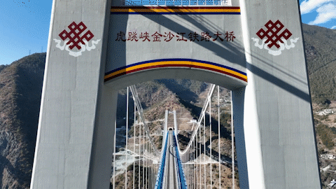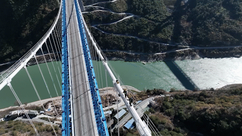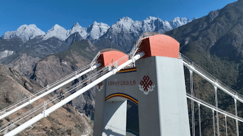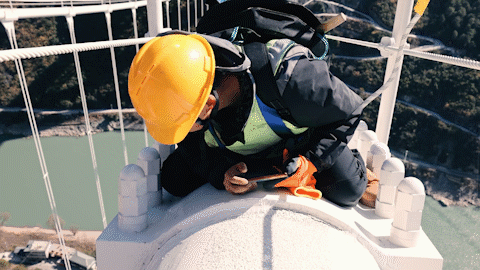 铁路工人对大桥主缆、塔身主体结构、大桥阻尼器等进行巡检,难度最大的地方在于主缆检修,单侧巡检往返大概需要3个小时,行走在主缆上,脚下是湍急的虎跳峡江水,身旁是呼啸的江风,每一步都需要格外小心。