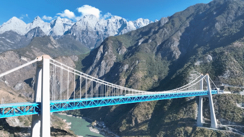 虎跳峡金沙江铁路大桥位于云南丽江与香格里拉交界处的虎跳峡景区,横跨金沙江,桥面离江面垂直距离约250米,主桥采用悬吊上承式钢桁梁悬索桥,大桥两端分别与玉龙雪山隧道和哈巴雪山隧道连接,是丽香铁路重点控制性工程。