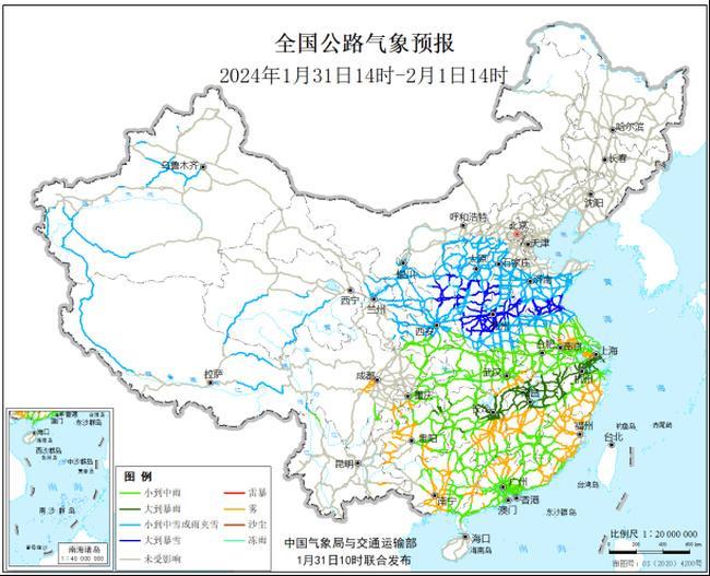 预计1月31日中午至2月1日中午,陕西中北部、山西中南部、河北西南部、河南中北部和西部、山东南部、江苏北部等地部分路段受大雪影响,陕西中部、山西南部、河南西部等地部分路段受暴雪影响。另外,江苏西南部、浙江东南部、福建中部、广东北部、广西中部、云南东南部、贵州中西部、四川盆地等地局部道路受雾影响能见度低(见图4,附件1)。