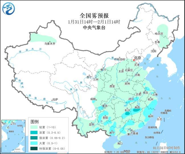 预计1月31日夜间至2月1日上午,湖北南部、浙江东部、江西中部、湖南中南部、广东北部、广西中部、贵州南部等地有大雾天气,局地能见度不足200米(见图1)。