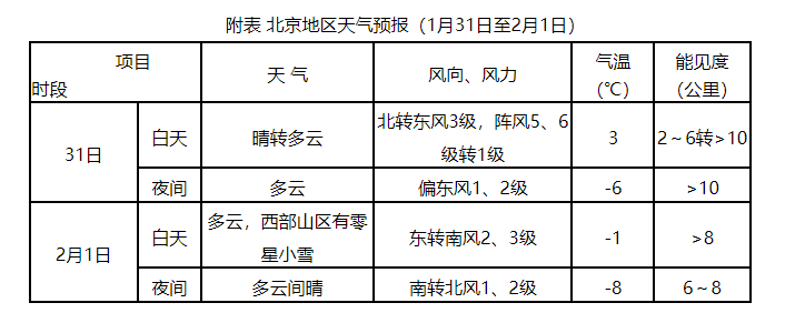 预计1月31 日至2月1日,北京地区以多云为主。受冷空气影响,31日早晨至中午有3 级左右偏北风,阵风 5、6 级,东部地区阵风相对明显,午后风力逐渐减小,大气扩散条件和能见度明显转好。2月1日西部山区有零星小雪天气。