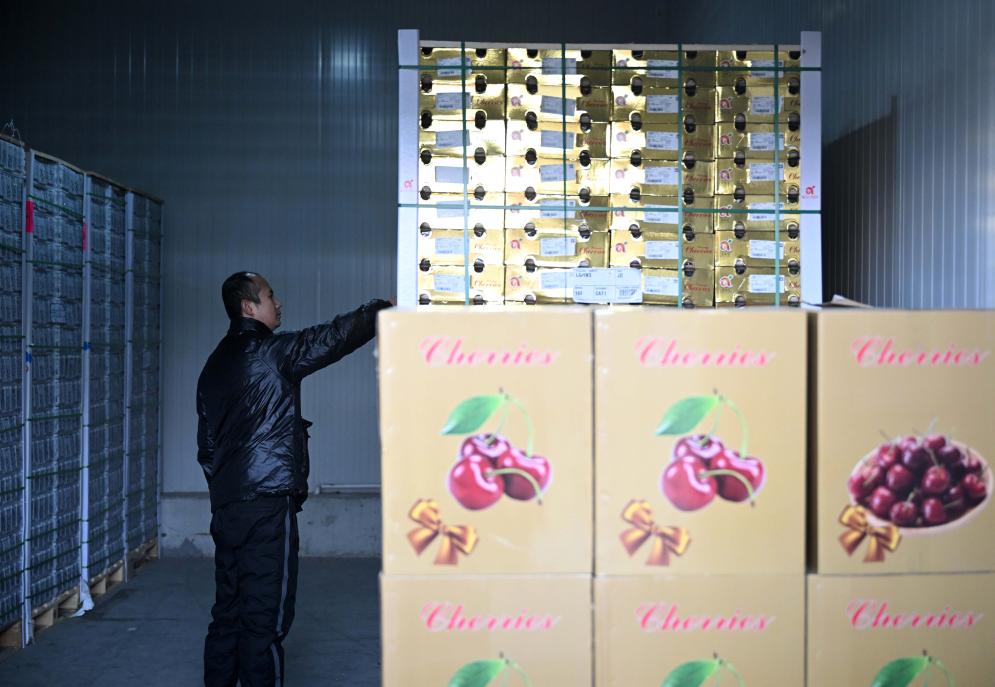 1月17日,在天津东疆保税港区,东疆海关工作人员正在查验进口车厘子。新华社记者赵子硕摄