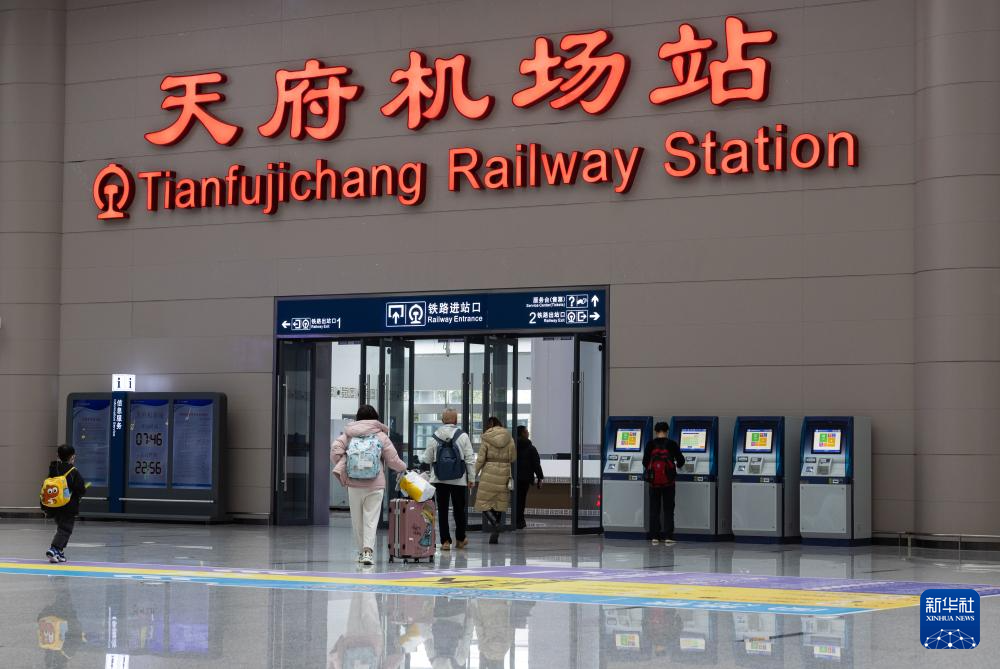 1月26日,旅客走进天府机场综合交通换乘中心(GTC)天府机场高铁站。新华社记者 江宏景 摄