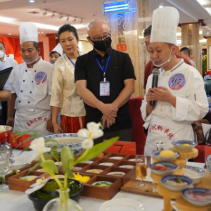 2023年6月9日,在云南省蒙自市职业技能大赛现场,参赛选手向评委讲解他制作的过桥米线。(廖茜 摄)