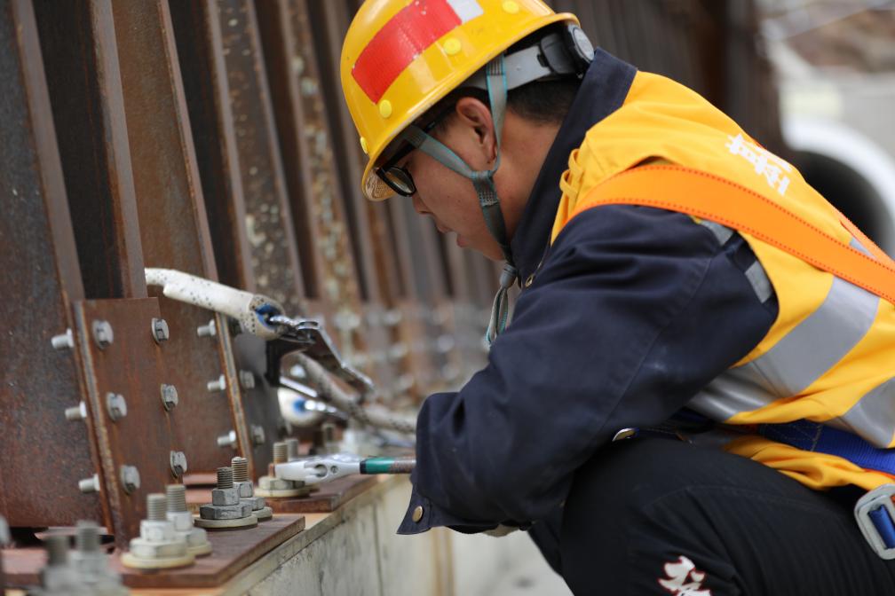 加查桥隧工区副工长张亮在检查藏木特大桥螺丝锈蚀情况(1月27日摄)。新华社发(拉巴次仁摄)