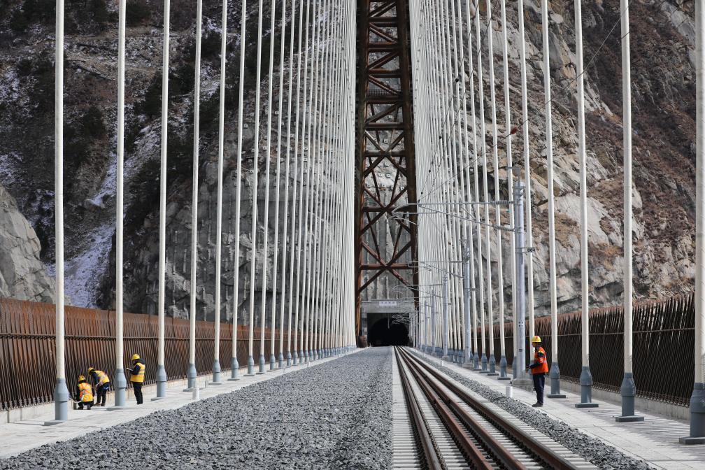 加查桥隧工区维护人员在检查藏木特大桥的挡风板和吊杆(1月27日摄)。新华社记者 刘洲鹏 摄