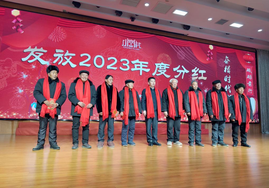 每年的小岗村分红大会,如同一场年度“村晚”。村民们欢聚一堂、喜气洋洋,自编自演身边事,吹拉弹唱心里话,把小岗村一年来的变化道个精彩。8位“大包干”带头人坐在第一排,作为村民代表上台领取分红。