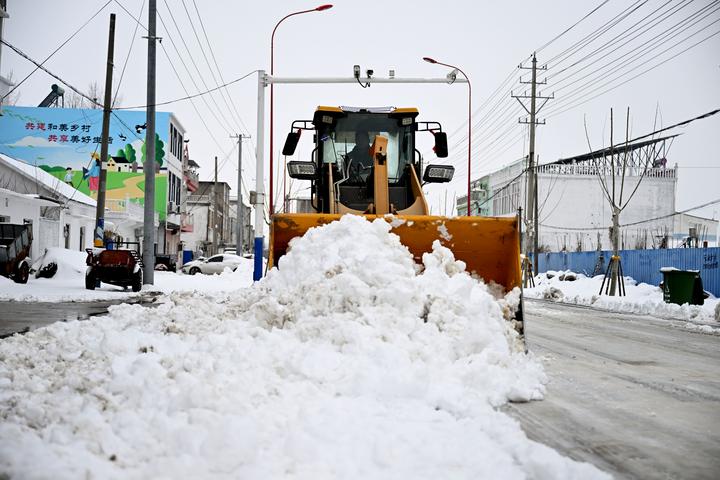 2月2日,在安徽省滁州市凤阳县小溪河镇梨园村,村民蒋华东驾驶铲车除雪。新华社记者 黄博涵 摄