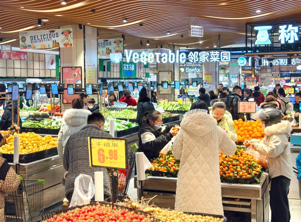 2月2日傍晚,安徽省滁州市凤阳县的一家大型商超内,人们正在生鲜食品区选购。新华社记者郭晨 摄