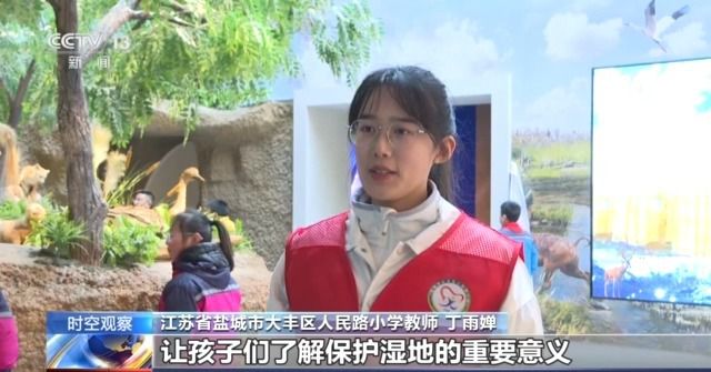 江苏省盐城市大丰区人民路小学教师 丁雨婵:我们就是想通过这样寓教于乐的形式,让孩子们了解保护湿地的重要意义,让他们在直观的参观过程中形成保护生态环境的理念,影响和带动身边的人珍爱湿地、保护湿地。