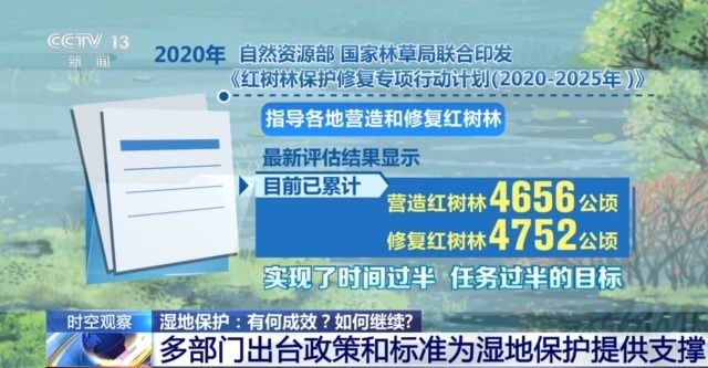 2020年,自然资源部、国家林草局联合印发《红树林保护修复专项行动计划(2020—2025年)》,指导各地营造和修复红树林。最新评估结果显示,目前已累计营造红树林4656公顷,修复红树林4752公顷,实现了时间过半、任务过半的目标。2023年,国家林草局出台《小微湿地保护与管理规范》等国家标准3个、《湿地生态修复技术规程》等行业标准5个,为湿地保护修复提供科技支撑。