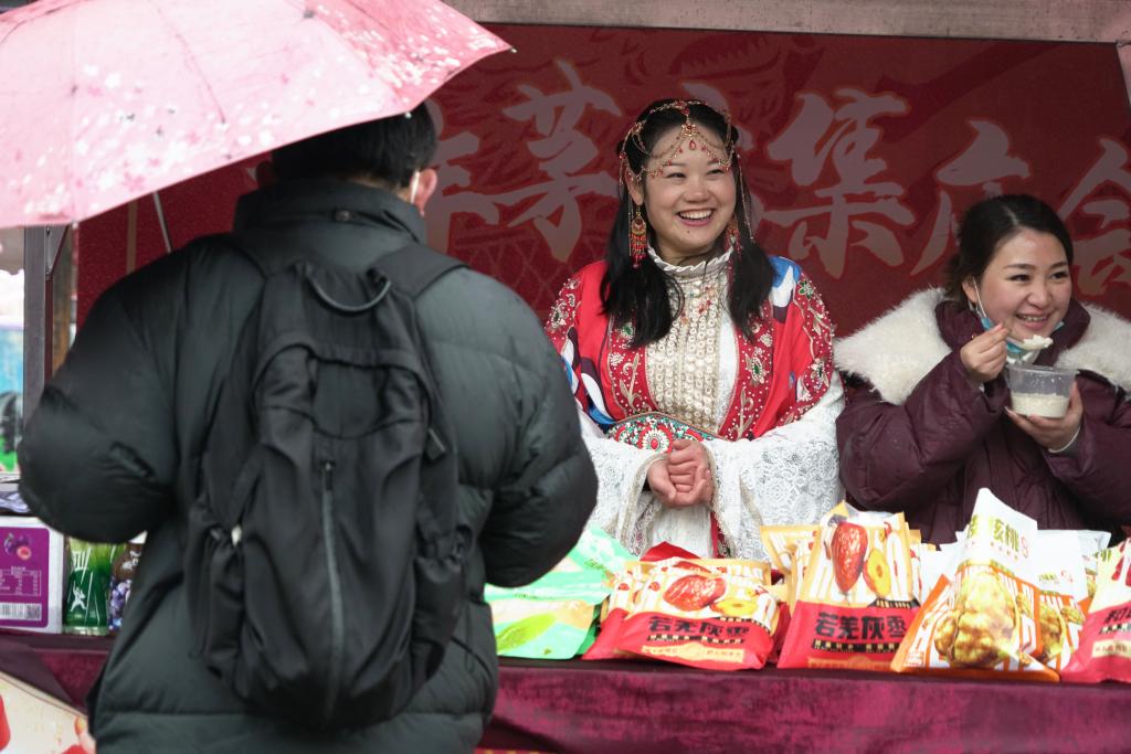 刘拾苹是新疆农产品企业域美攸香的客户经理。早上5点,她特意穿上新疆民族服饰,带着一箱箱新疆大枣赶到庙会现场。“雨越下越大,本来还有些担心,但开市两个小时,我们的营业额已经超过1000元了。”她一边说,一边招呼围拢过来品尝大枣的顾客。