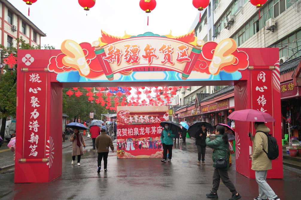 淅淅沥沥的冬雨冲洗着武汉东西湖区柏泉古镇的街道,作为当地的春节习俗,茅庙集庙会2月1日至3日举办。除了传统的武汉本地腊肉、炸肉圆等,今年庙会上最火爆的是来自新疆的年货。