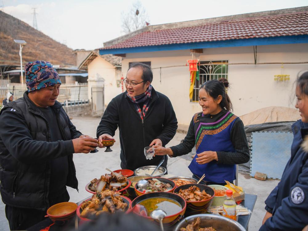 忙活许久,热气腾腾的腊肉、羊肉、鸡肉端上桌,巴木招呼全家人上桌吃饭,欢声笑语回荡,充满对新一年的美好期盼。