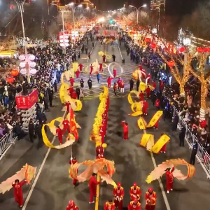 北方小年夜,固安县新中街张灯结彩、人声鼎沸,气势恢宏的“龙腾鼓乐”热闹开场。