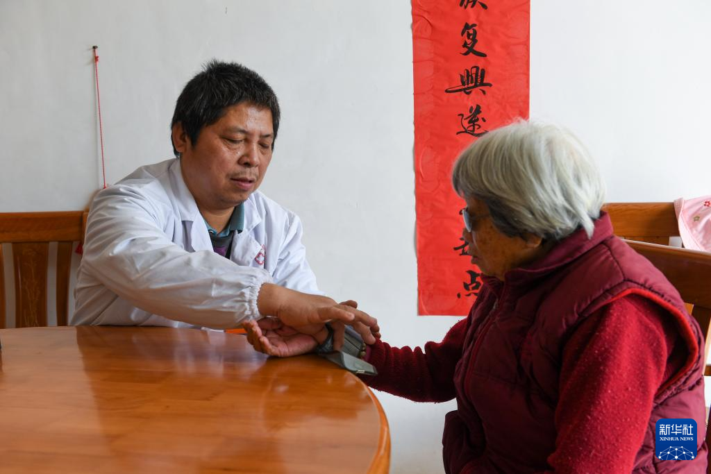 1月31日,在广东省云浮市郁南县东坝镇大迳村,郑仁才为90岁的村民黄肖方测量血压。