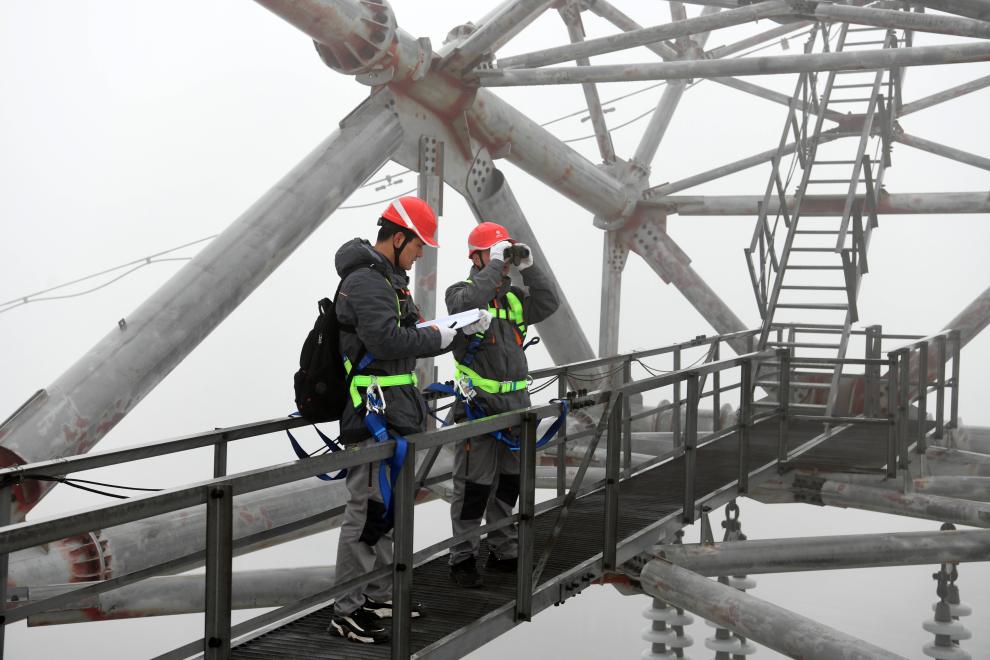 攀爬、瞭望、巡线、除险……在芜湖市长江之畔,安徽送变电工程有限公司“95后”员工张洲和张磊磊正在近300米高的1000千伏电塔上作业。他们在风雨中守护的是淮芜线长江大跨越北站电塔,也是安徽淮南煤电输送至华东地区的重要能源通道。