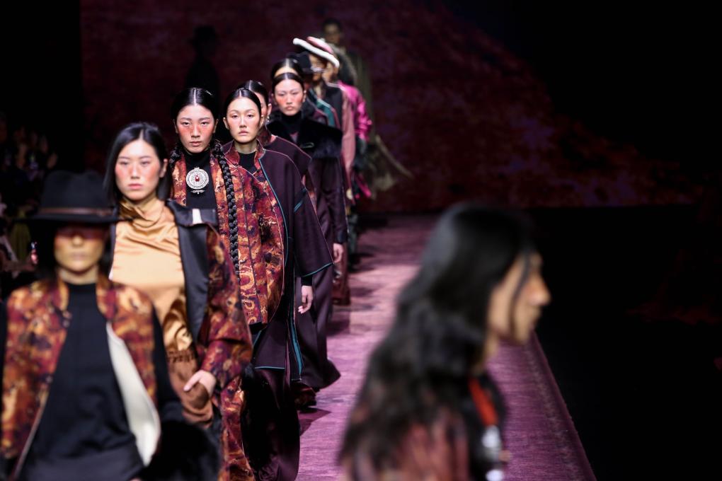 ↑2023年3月26日,模特在2023秋冬上海时装周展示荷木HEMU时装。