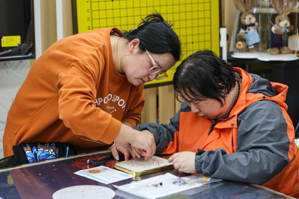 ↑2023年4月11日,刘莹在虹口区曲阳社区阳光心园教学员做钉子画。