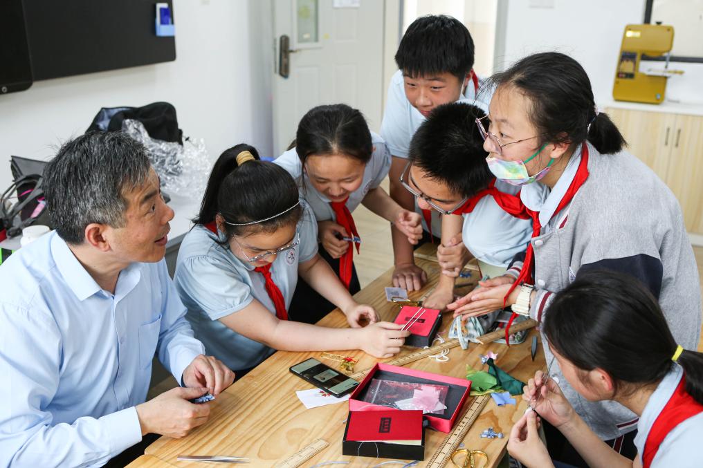 ↑2023年5月30日,江满宗(左一)在上海市青云中学教学生做盘扣。