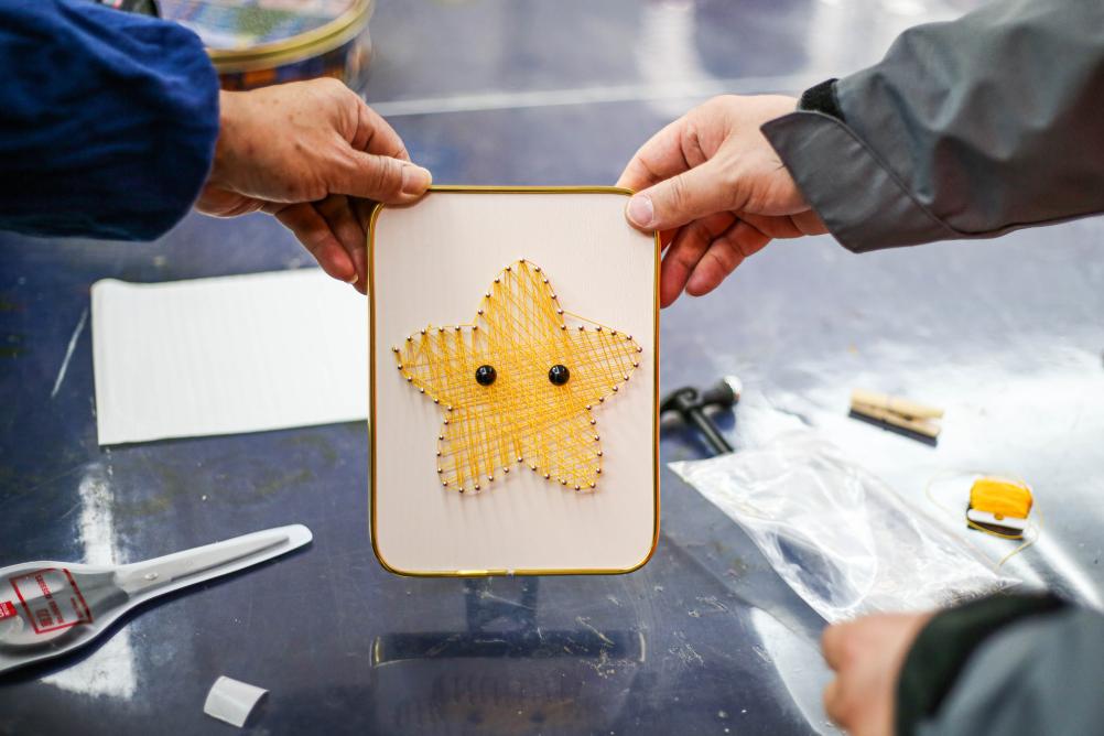 ↑这是2023年4月11日在虹口区曲阳社区阳光心园拍摄的学员钉子画作品。
