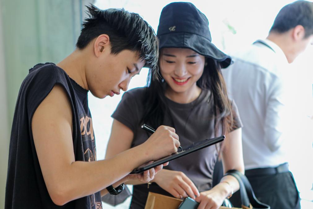 ↑刘莹在上海虹口区青少年活动中心用手语与助手沟通(2023年5月18日摄)。