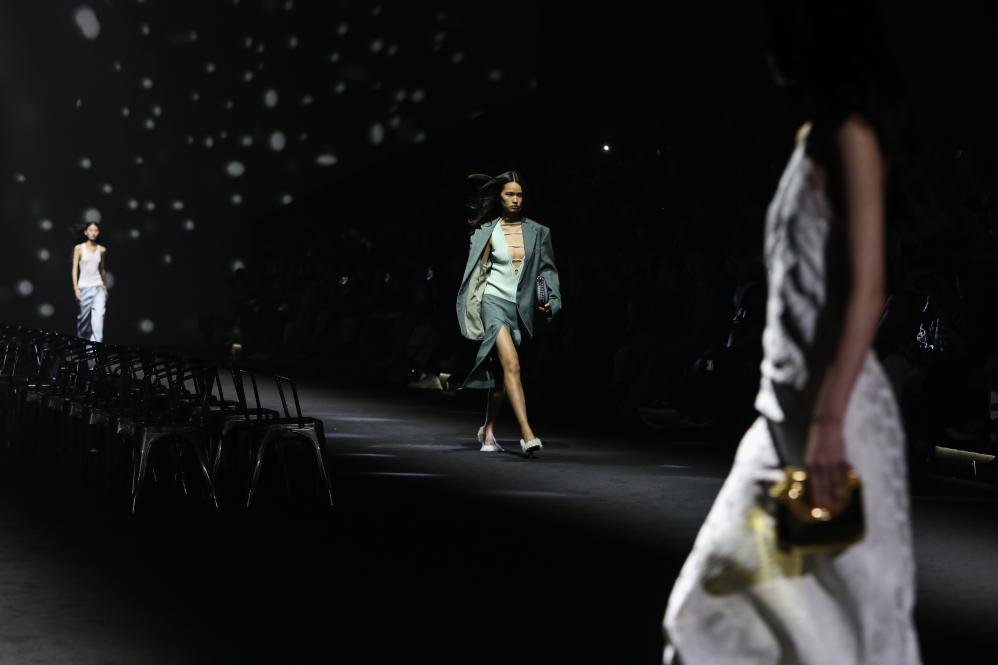 ↑2023年10月16日,模特在2024春夏上海时装周Stella McCartney品牌发布会上展示时装。