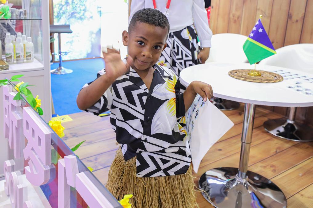 ↑2023年11月6日,一名来自所罗门群岛的小朋友在第六届进博会国家展所罗门群岛展台打招呼。