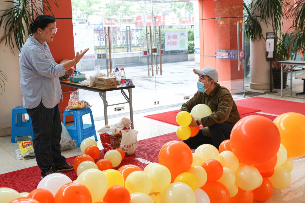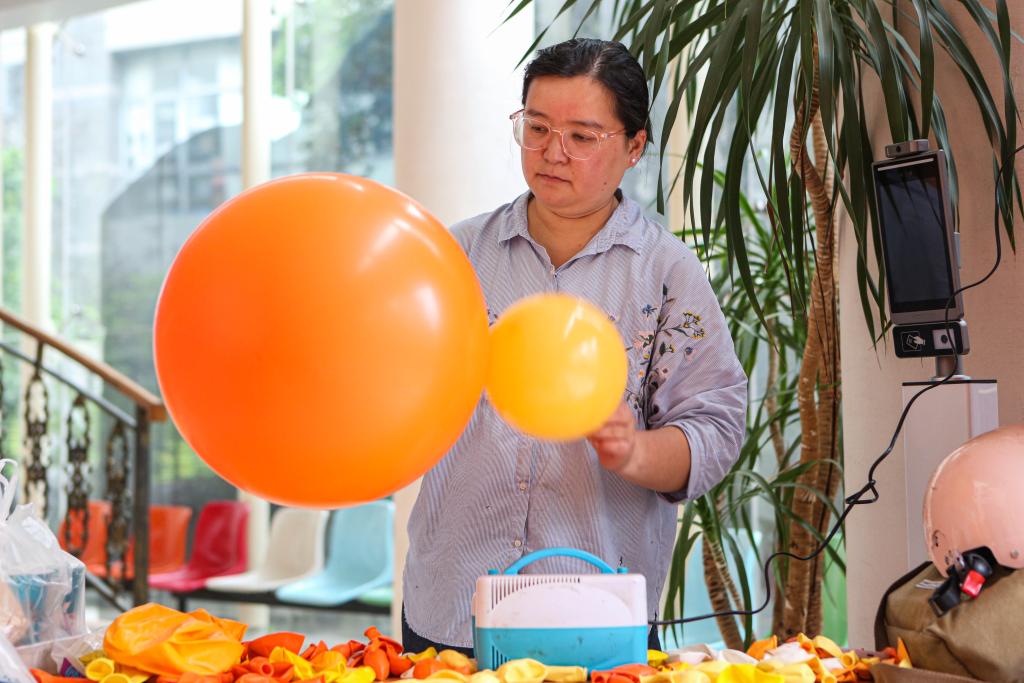 ↑刘莹在上海虹口区青少年活动中心制作气球(2023年5月18日摄)。