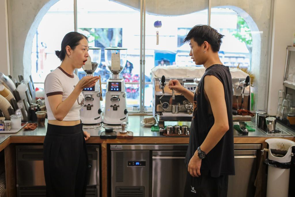 ↑2023年8月10日,“无声咖啡馆”老板倪蕊与店员交流。