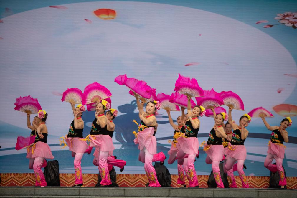 2月2日,在秀山县民俗文化展演现场,演员们正在表演舞蹈《闹花灯》。(胡程 摄)