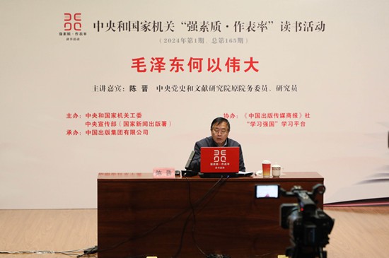 2月3日,中央和国家机关“强素质·作表率”读书活动2024年第1期主题讲座在京举办。中央党史和文献研究院原院务委员、研究员陈晋以《毛泽东何以伟大》为题作讲座。中央和国家机关各部门党员干部近400人参加活动。