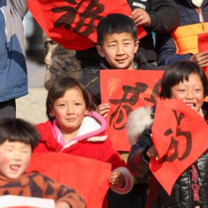 在甘肃省积石山县阳洼村,武警甘肃总队临夏支队官兵和小朋友一起展示“福”字(1月30日摄)。新华社发(侯崇慧 摄)