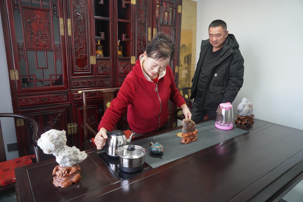 全永利(右)和妻子李翠兰在新房中准备给客人沏茶。新华社记者 李云平 摄