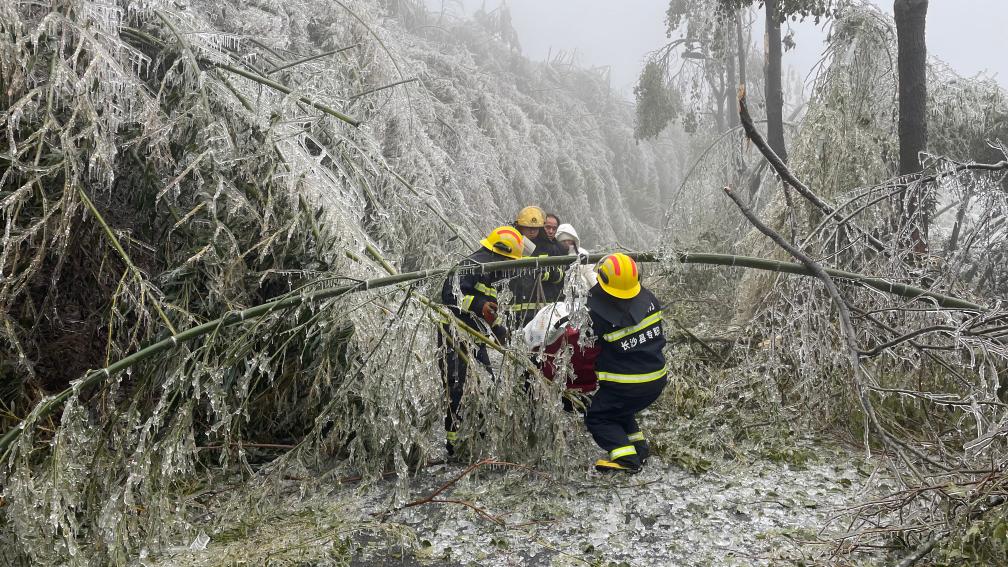 2月6日,长沙县福临镇专职消防救援队营救婴儿时通过一处倒伏的树木。新华社发