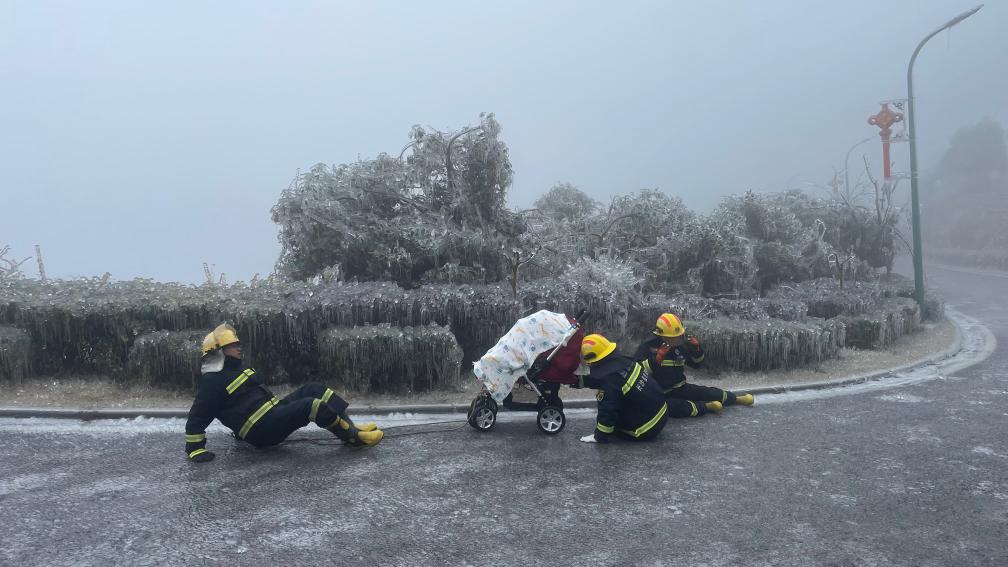 6日下午4时许,众人安全下山。消防员虽时有摔倒,衣服和头发都沾上了冰雪和泥浆,但婴儿车在他们的守护下,稳稳当当。记者了解到,影珠山海拔500余米,本次救援行动中,消防员们一共耗费了8小时,徒步行进了9公里。