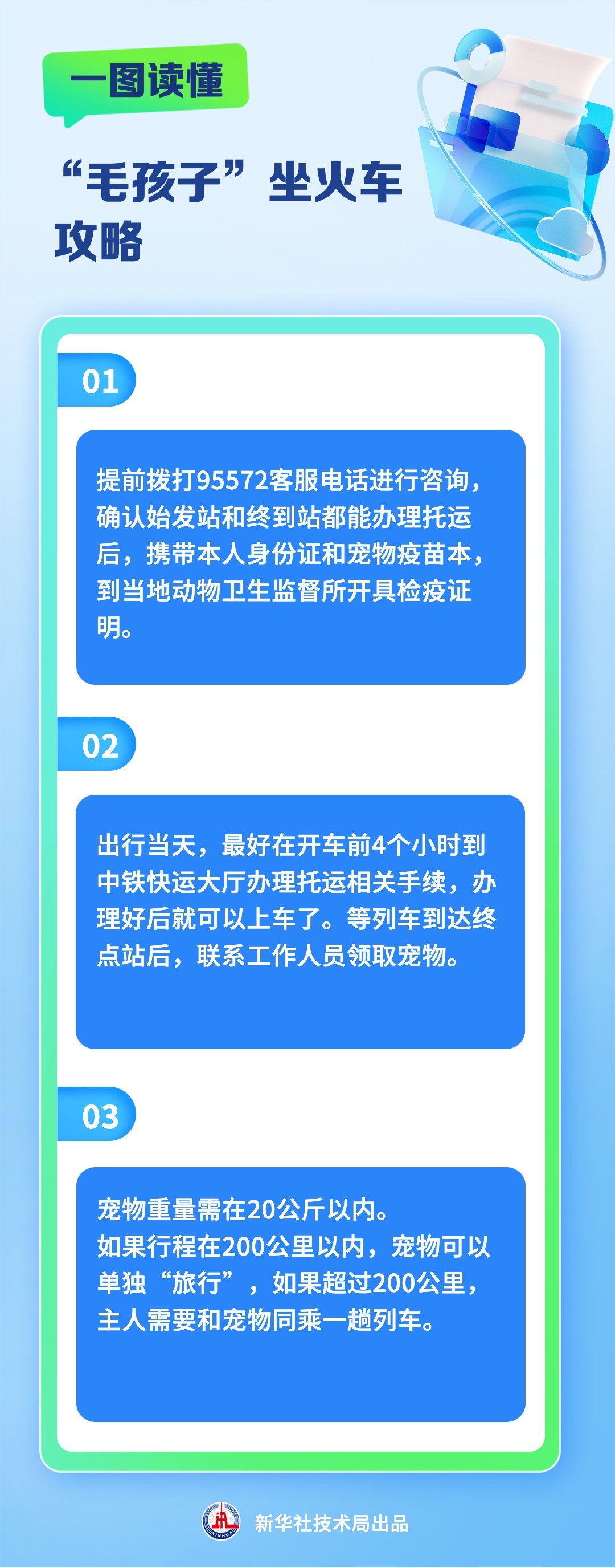 新华社太原2月8日电(记者李紫薇 马晓洁)春节期间宠物怎么办,已经带回家的宠物怎么带回来?这成了返乡“铲屎官”们的大难题,也成了宠物们必须要过的“年关”。记者了解到,有些绿皮火车可以托运宠物,目前线路覆盖了部分省会和大中城市,具体可提前拨打中铁快运客服电话95572进行咨询。不过,根据相关规定,能够主动攻击伤害人的猛兽和蛇、蝎子、蜈蚣、蜂等不得承运。下面就带您了解一下“毛孩子”乘坐火车的流程。