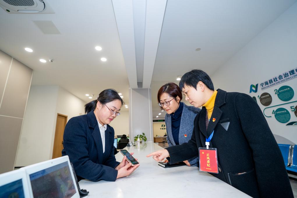 图为宁波市宁海县纪检监察干部在该县社会治理中心了解手机APP、各类档案台账“瘦身”情况。 (童少儒 摄)