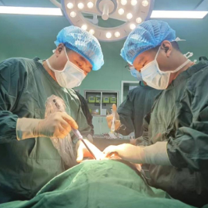 北京儿童医院保定医院肿瘤外科主任孟德光(左一)正在为患者实施手术。(受访单位供图)