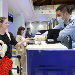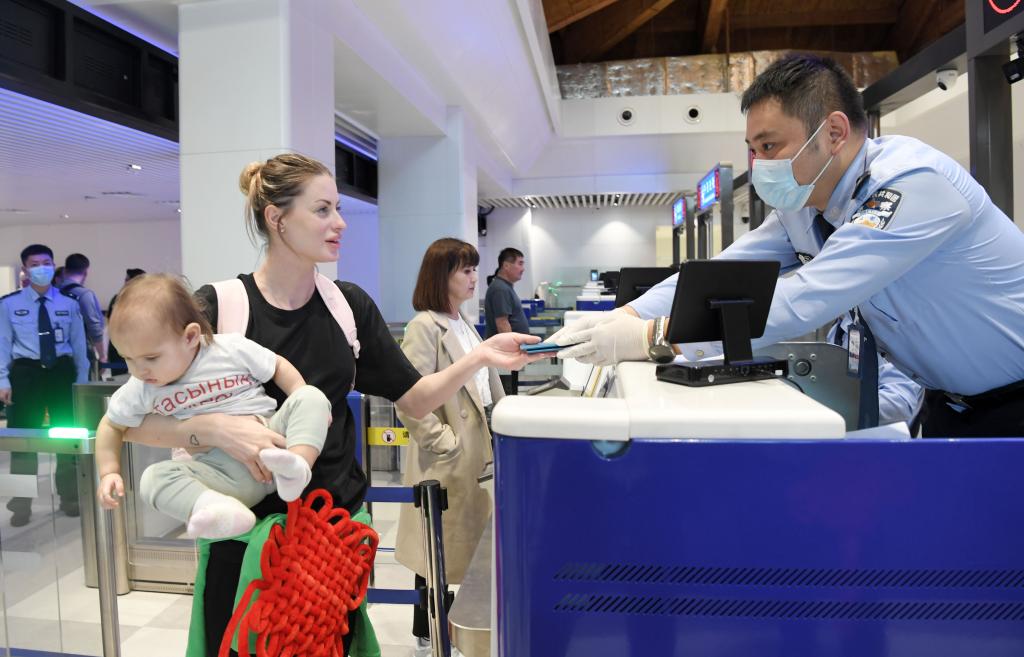 2024年1月31日,在三亚凤凰国际机场,凤凰出入境边防检查站民警为入境旅客办理入境手续。 新华社记者赵颖全 摄