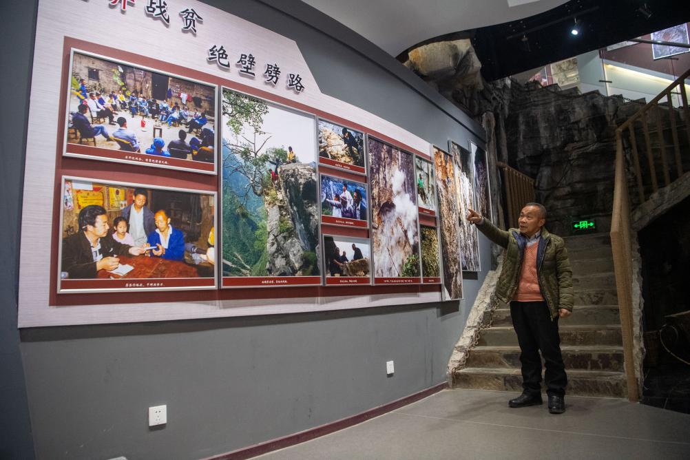 修路带头人毛相林在下庄精神陈列馆讲述当年修路的故事。新华社记者唐奕 摄